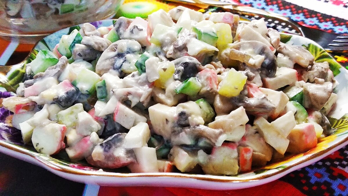 Всем здравствуйте! Если классический салат с крабовыми палочками вам изрядно надоел, попробуйте приготовить его с жареными шампиньонами!!! Шампиньоны очень хорошо сочетаются с варёными яйцами и крабовыми палочками. Только крабовые палочки используйте вкусные и качественные, от них будет зависеть вкус салата. Для приготовления салата нам потребуется: Приготовление: 1. Лук очистить от шелухи, нарезать мелким кубиком и обжарить на сковороде с небольшим количеством растительного масла. 2. Шампиньоны промыть в воде и нарезать небольшими кусочками. 3. Добавить шампиньоны в сковороду к луку и обжарить до тех пор, пока не испарится жидкость. 4. Дать грибам остыть. 5. Пока остывают шампиньоны, крабовые палочки нарезать кубиками или соломкой. 6. Огурцы также нарезать кубиками или соломкой. 7. Яйца очистить от скорлупы, нарезать брусочками или кубиками. 8. Соединить все подготовленные ингредиенты в салатнице, посолить по вкусу и заправить майонезом. Аккуратно перемешать. Салат с крабовыми палочк