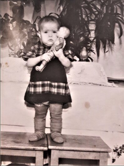 На одну свою зарплату мама не смогла бы купить телевизор. К этому времени сестра закончила училище и работала лаборанткой на практике. Названия ПТУ не помню, но знаю что готовили специалистов для мясо-молочной промышленности. Вот вдвоём они и скопили. Мне ничего не говорили, хотели сделать сюрприз. Не подумали, что от радости и восторга тоже может стать плохо. Как обычно, прихожу домой со школы. На столе, где стоял фикус, стоит телевизор «Спутник 61». Настолько это было нереально, что я спрашиваю: «Чей?» «Наш». Когда убедили, что наш, я потеряла дар речи. «И показывать будет?». «Конечно». На фотографии за мной парадный стол с вышитой красивой скатертью. На нём стоял любимец мамы - огромный фикус. Телевизор сместил его на табуретку и занял почётное место. Телепередачи шли не весь день, а в определённое время. Несколько часов до трансляции не могла оторвать глаза от чуда и ни о чём другом думать. Чтобы не изнывала, мне велено было натаскать воды с колонки полный бачок, сходить за хлебом