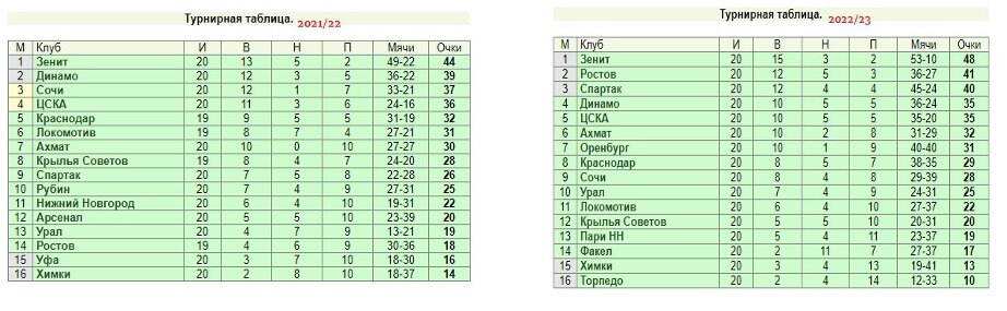 Сегодня мы предлагаем Вам сравнить итоги 20 туров сезонов 2021/22 и 2022/23. Поговорим о прогрессе команд и заметных спадах в расстановке.