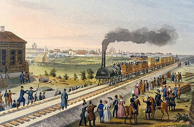 Как вы, возможно, уже знаете, Витебский вокзал - это первый вокзал появившийся в Российской Империи и на мой вкус один из самых красивых в России. Он был открыт в 1851 году и был назван так в честь города Витебска, который находится в Беларуси. Зарождению железнодорожного сообщения в Российской Империи мы обязаны Николаю I и предпринимателю и инженеру Франц фон Герстнер, последний был невероятным поклонником технического прогресса в целом и железнодорожных дорог в частности. Целый год инженер добивался встречи с Императором, чтобы обсудить с ним проект строительства железной дороги и лучшими аргументами были военные преимущества объекта. Первая линия соединила Петербург с Царским селом. Так выглядел первый железнодорожный состав привезенный из Англии. Поезд состоял из 8 вагонов и паровоза в составе поезда были вагоны 4х классов: Первое время железная дорога и поезда вызывала ужас у местных жителей, так как это были не всеми привычные повозки с лошадьми, а что-то железное и двигающееся