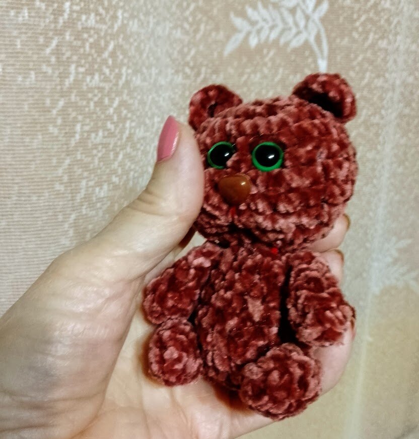 Предлагаю вашему вниманию,брелок из плюшевой пряжи.Вяжется легко за один вечер.По этой схеме можно вязать,котика, мишку,зайку.Меняем только ушки, и хвостики. Мишка. Голова. 1.КА=6сбн 2.+*6=12сбн 3.1сбн+*6=18сбн 4.2сбн+*6=24сбн 5.3сбн+*6=30сбн 6.4сбн+*6=36сбн 7.5сбн+*6=42сбн 8.42сбн 9.5сбн-*6=36сбн 10.4сбн-*6=30сбн 11.3сбн-*6=24сбн 12.2сбн-*6=18сбн 13.1сбн-*6=12сбн Набиваем холофайбером ,но не сильно оставляем нить для пришивания. Тело. 1.КА=5сбн 2.+*5=10сбн 3.1сбн+*5=15сбн 4.2сбн+*5=20сбн 5.3сбн+*5=25сбн 6.4сбн+*5=30сбн 7.30ссбн 8.4ссбн-*5=25сбн 9.3сбн-*5=20сбн 10.2сбн-*5=15сбн 11.1сбн-*5=10сбн Набиваем холофайбером, но не сильно, оставляем нить для пришивания. Лапки и ножки вяжутся одинаково, Лапки на один ряд короче. Холофайбером не набиваем. Лапки передние и задние. 1.Ка=3сбн. 2.1+*3=6сбн 3.1сбн+*3=9сбн 4.9сбн 5.1сбн-*3=6сбн Уши. 1.Ка=6сбн 2.поворот 3.3сбн +3сбн. Ушко нить длинная в начале вязания и в конце, для пришивания. Сборка. 1.Пришиваем голову к телу. 2.Пришиваем ножки. 3.Пр