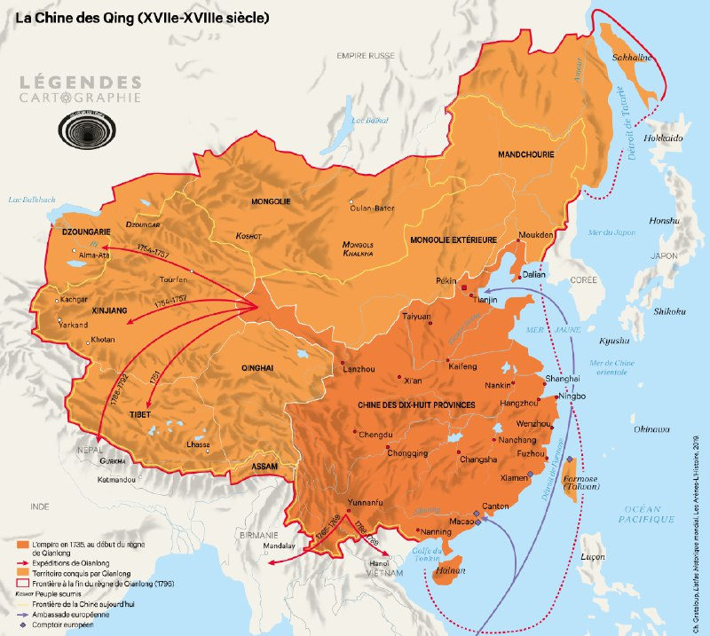 Цинский Китай - 18-й век, период расцвета. И самый большой расцвет Китая за все время существования. На Западе Китай занимал территории современного Казахстана до озера Балхаш, на севере и северо востоке территории севернее Амура, весь российский Приморский край и Сахалин. Ага, Япония с Россией могут спорить вокруг островов, а Китай может претендовать на весь Сахалин.
