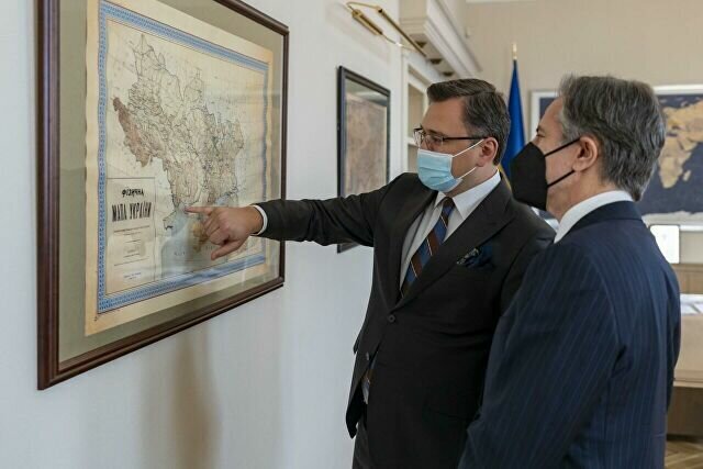 На Украине начинают об этом говорить со школы(и в университетах), там рассказывали детям(и студентам) до событий 2014 года и после последних событий особенно, о землях якобы принадлежащих Украине, которыми Россия владеет незаконно. И у министра иностранных дел Украины висит карта с этими"украинскими землями". Карта великой Украины. А на фотографии министр иностранных дел Украины Кулеба показывает что-то госсекретарю США Блинкену. А на этой карте большая часть Воронежской области(земли бывшего Острогожского слободского полка), и Ростовская область(земли Донского казачьего войска), Краснодарский край(земли Кубанского казачьего войска) и часть Ставропольского края(земли терского казачьего войска) - это территории Украины.