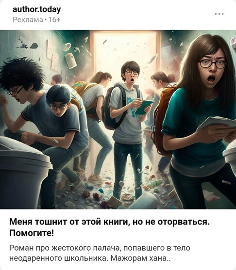 Делюсь очередным уловом встрат… очень креативных рекламок сетературы. Во-первых, иллюстрация ‒ она воистину прекрасна! Судя по паникующим детишкам с рюкзачками, здесь изображено какое-то помещение в школе: то ли столовка, то ли тубзалет. Кучи летающего мусора и… Бог ты мой, что это?! У Поттероподобного мальчика внезапно из плеча выросла вторая голова?! И во-вторых, описание. Кто-то не может оторваться – гм… где-то мы уже это видели… Точно, это же наша веселая читающая семейка! Эх, рано мы обрадовались, что у нашей семейки все хорошо! Кого-то тошнит от книги и бросить ее читать этот кто-то не может. Злой «Некрономикон» захватил разум – не иначе! Здесь у нас внезапная цитата. Прости, Роршах, мы всё про… даже не можем правильно её воспроизвести. Если что, речь идет о нуарном антигерое-мстителе из фильма 2009 года «Хранители» (и одноименном комиксе Алана Мура, на котором этот фильм основан). А это описание из рекламной карточки мне прислала создатель канала «Причинять добро», за что ей бол