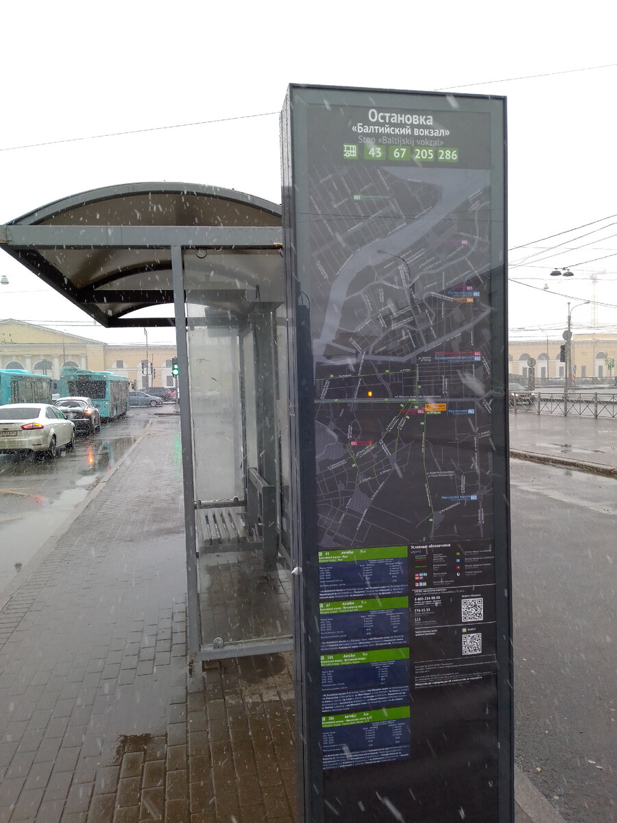 Автобусный маршрут № 205. Первый рейс от Балтийского вокзала в 5:31, заключительный в 0:01. Маршрут работает только по будним дням. Почему — не понятно. Во-первых, явно какие-то организации этой промышленно-деловой зоны работают и по выходным. Во-вторых, здесь есть и жилые дома. В-третьих, связь Кировского, Красносельского, Петродворцового районов с Балтийским вокзалом нужна и по выходным. Интервалы движения от 11 до 25 минут. Излишне говорить, что для маршрутов, работающих по интервальному расписанию, интервалы движения более 20 минут ненормальны.