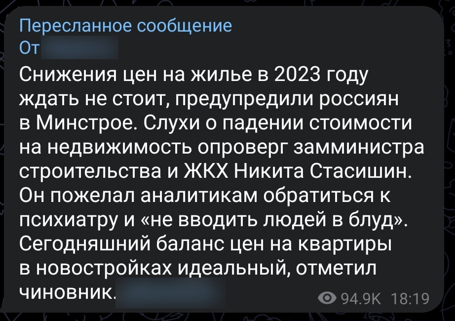 Не был удивлён и тому, что нас отправили к психиатру. Именно нас, ведь многие читатели согласились со мной о завышенности цен на новостройки в нескольких моих статьях. Но всё же решил посмотреть, не "раздули" ли Телеграм-каналы эту новость, и нашёл прямую цитату.