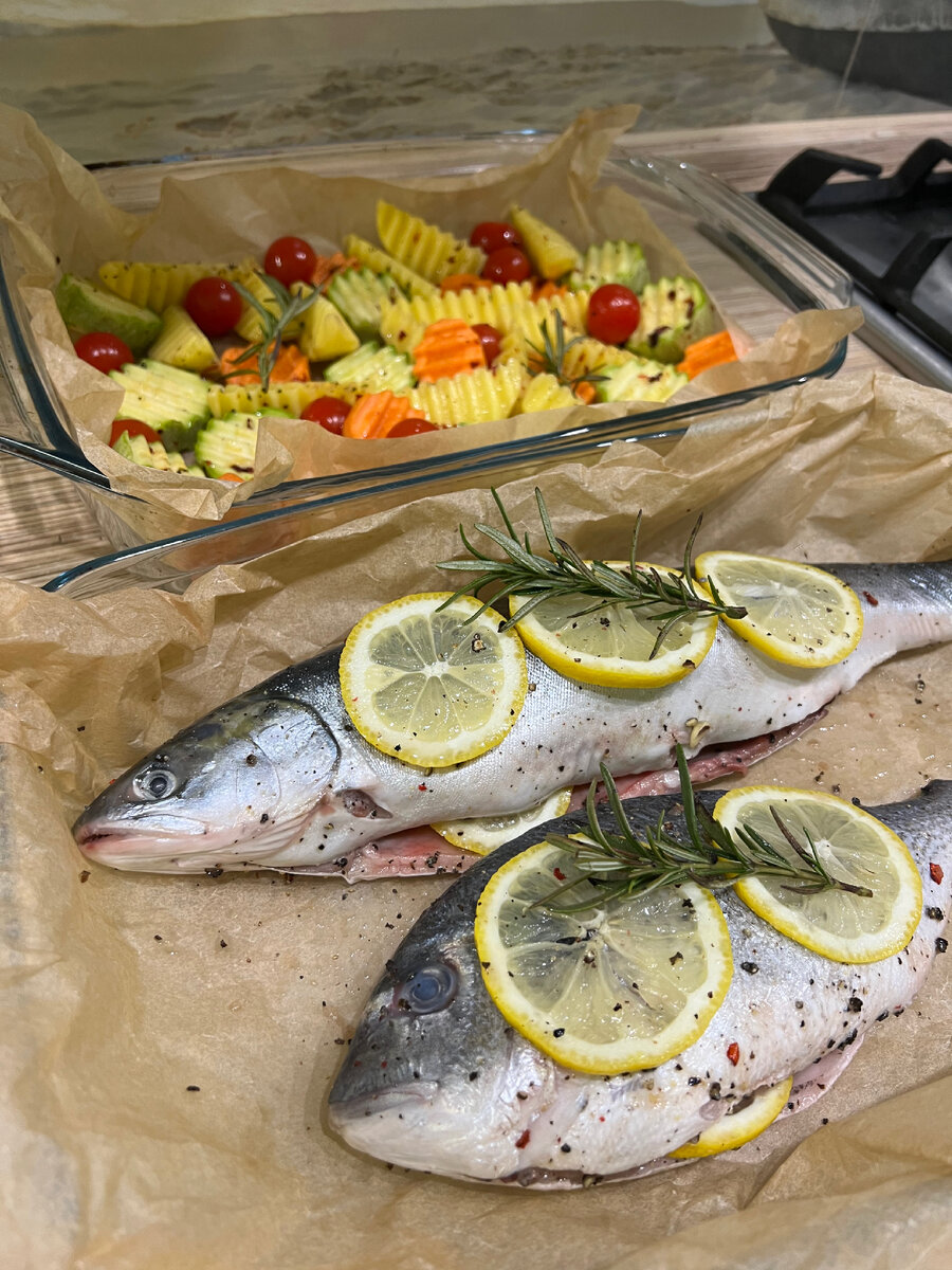 Тут все просто до невозможности, это вам не куличи, да тортики печь. Когда готовит муж это всегда просто, быстро и ну оооочень вкусно🔥 Для приготовления нам понадобится муж, эээ… то есть я хотела сказать нож! Рыба голец и/или дорадо (впрочем рыба может быть любая), потрошим ее, смазываем растительным маслом, солим, перчим (желательно смесью перцев крупного помола), брызгаем соком лимона, закладываем дольки лимона в брюшко, сверху рыбки тоже положим лимончик, если есть ещё веточки розмарина, если нет, то ничего страшного👌🏻 Кладём рыбку на пергамент и в духовку минут на 40 при 200-220 гр. В это же время чистим любые овощи, крупно режем, немного растительного масла, соль, перец крупного как помним помола, паприка крупная, перемешиваем и на пергамент туда же в духовку. В процессе можете поменять местами противни верх/низ, чтобы все немного подрумянилось.