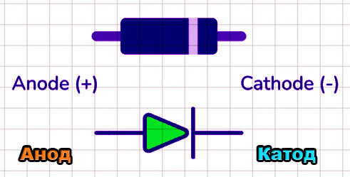 Выпрямительные диоды позволяют току течь только в одном направлении, от анода к катоду, также называемому прямым смещением . Выпрямительный диод в прямом смещении плюсовой провод подключается к аноду, а катода к отрицательной стороне. Вы можете увидеть это в примере ниже: