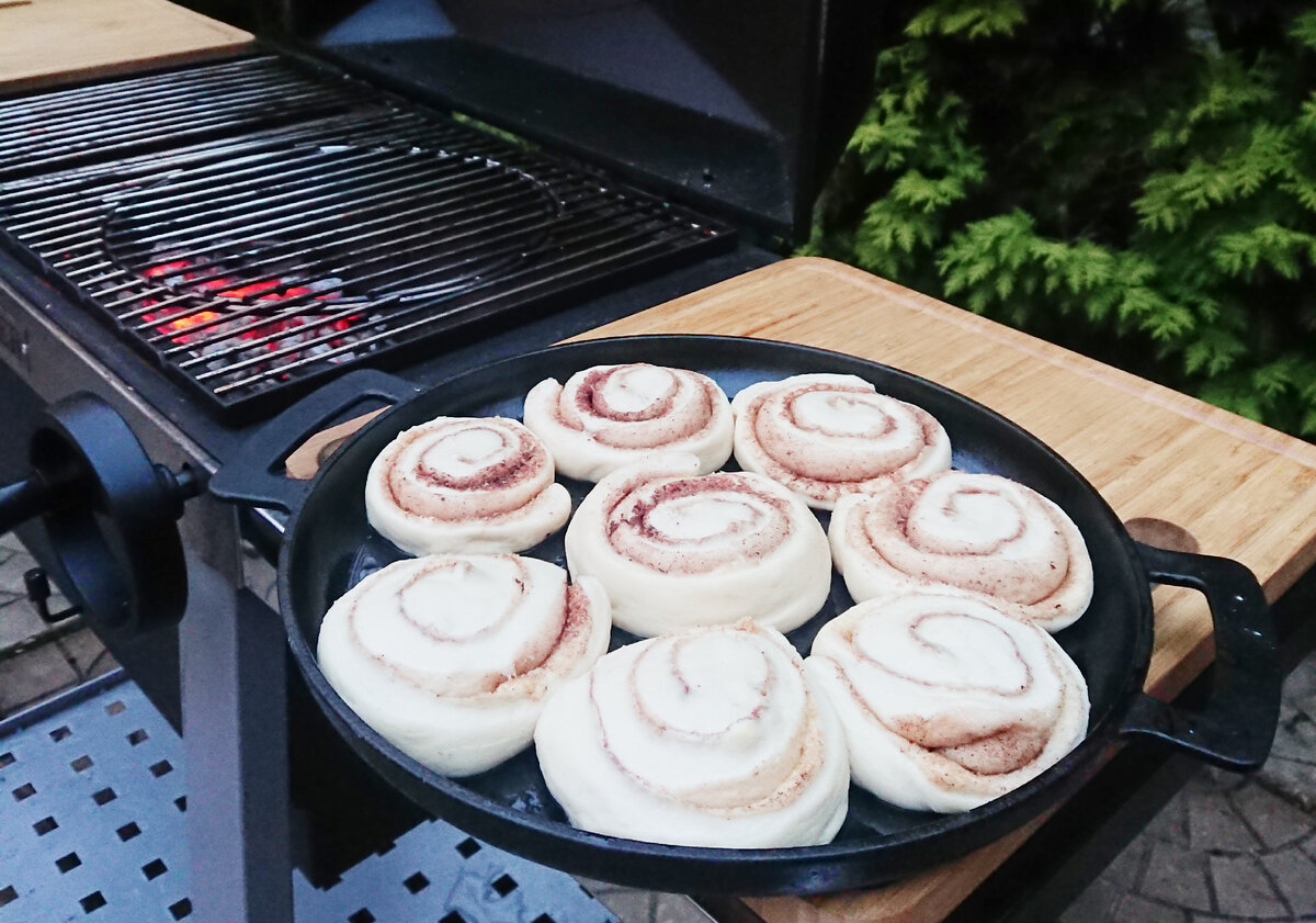 Однажды мне захотелось приготовить булочки с корицей у себя на даче, но духовка там отсутствовала. Зато в наличии был гриль, где я и приготовил булочки с корицей. Булочки получились, хотя в процессе всплыли некоторые нюансы готовки выпечки на гриле, которые я устранил в дальнейшем. Сейчас расскажу обо всем. Итак, что же нужно чтобы приготовить выпечку в гриле? Во-первых, нужен гриль с крышкой и регулируемой заслонкой доступа воздуха. Во-вторых, крайне желательно чтобы в гриле был встроенный термометр - без него сложно будет контролировать температуру внутри гриля. В-третьих, то на чем вы будете выпекать булочки. Я использую большую чугунную сковороду, которая помещается в мой гриль. Можно использовать камень для выпечки, но это весьма специфичная вещь, которая не у каждого имеется. Также обязательно потребуется хорошее настроение! Расскажу о самом процессе на примере приготовления булочек с корицей. Понадобится сдобное дрожжевое тесто примерно 600-700 грамм, сливочное масло 80 грамм,