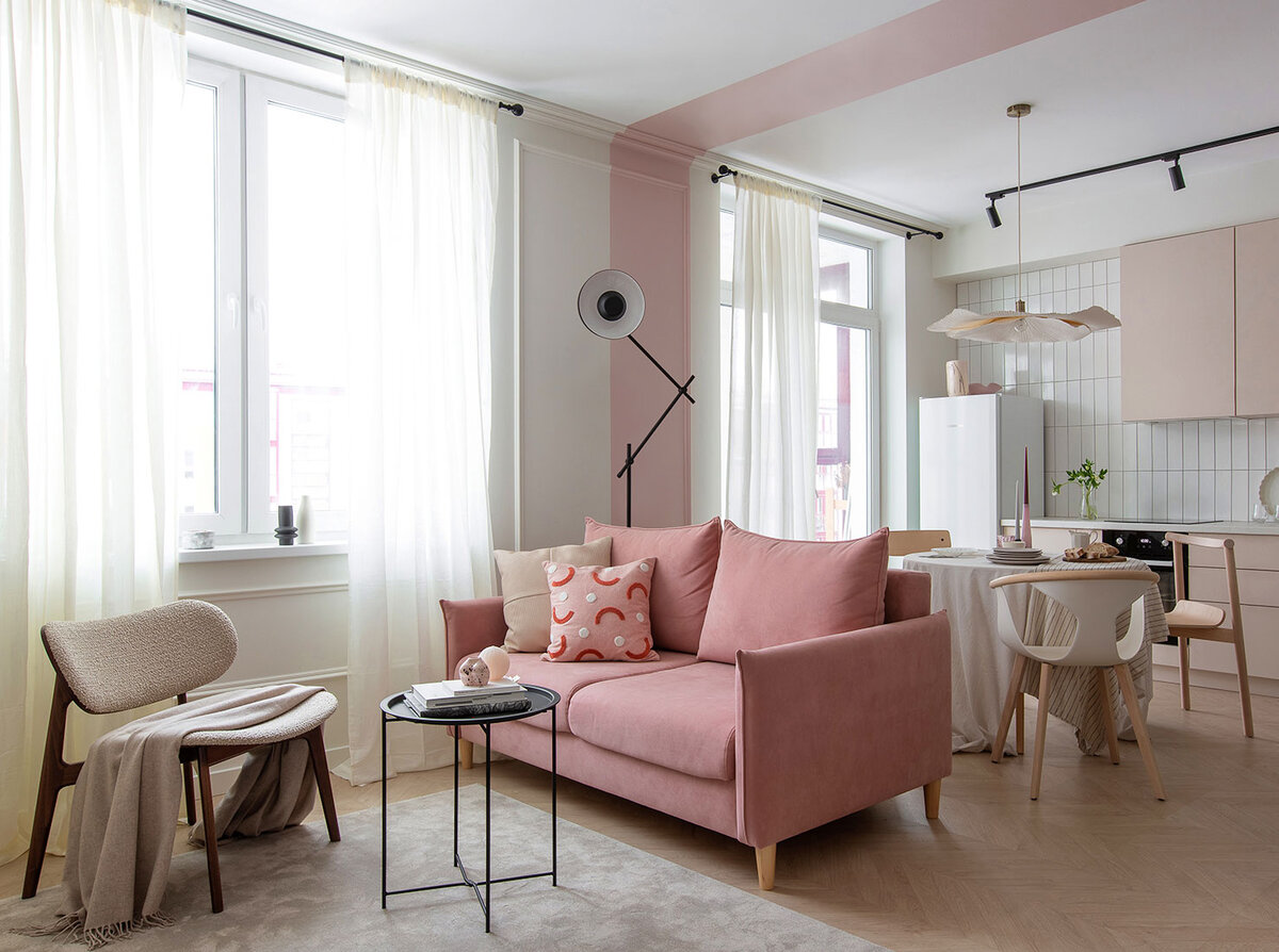 Заказчица — стюардесса, выбрала квартиру в ЖК «Образцовый квартал» рядом с аэропортом Пулково. Это ее первое самостоятельное жилье. «Мне было важно оттолкнуться от идеи «здесь и сейчас», создать пространство, в котором хозяйке будет комфортно в данный момент, а не подстраиваться под гипотетические планы: замужество, дети и прочее», — говорит дизайнер Маша Бондаренко. Существенным фактором в проекте был небольшой бюджет. Изначально это была однокомнатная квартира с квадратной лоджией, окном в пол на кухне и большим окном в комнате. Площадь — 35 кв. метров. Большое преимущество — водяной теплый пол, благодаря которому в квартире нет радиаторов. «Обычно радиаторы от застройщика выглядят не эстетично, а менять их на дизайнерские — дорого», — объясняет Маша Бондаренко. Чтобы наполнить квартиру естественным светом, дизайнер предложила изменить планировку: создать квартиру-студию, но с грамотным зонированием. Поскольку бюджет был небольшим, сразу отказались от идеи утеплить лоджию и сделать