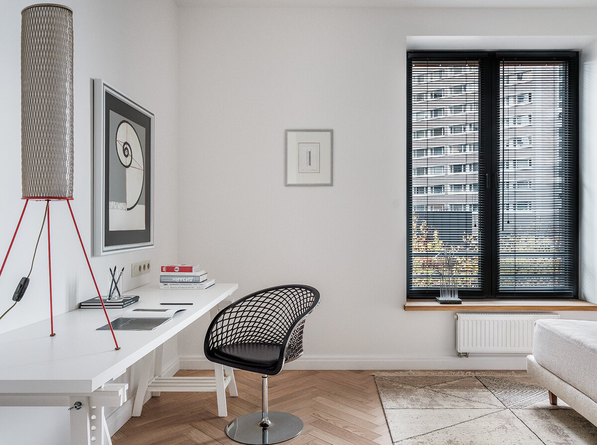 Рабочий стол под окном — традиционное решение, но тут вместо отдельно взятого предмета выстроили целую систему, которая идет углом, начинаясь большим шкафом и заканчиваясь низким стеллажом. Дело происходит в квартире, обставленной достаточно редкими французским брендами и авторской мебелью. Сделанная на заказ столярка должна соответствовать и, насколько можно судить по фотографиям, качество у нее вполне идеальное. Тут главное не увлечься и не перегрузить открытые полки и нескончаемые горизонтальные поверхности книгами и бумажками. Созданный дизайнерами образ хорош своей чистотой.