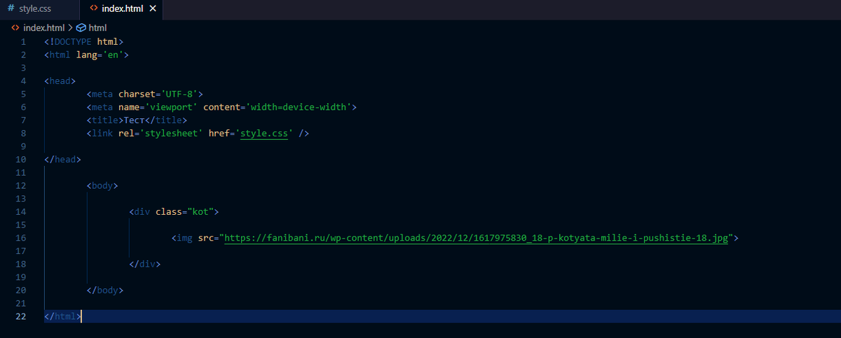 Второй способ: скачать картинку, положить ее в рабочую папку с вашим сайтом, и в коде указать к ней путь. Начнем. В HTML нужно создать информационный блок и прописать следующую команду: <div class="kot"> <img src="https://fanibani.ru/wp-content/uploads/2022/12/1617975830_18-p-kotyata-milie-i-pushistie-18.jpg"> </div> "<img src="..." " дословный перевод, ссылка на картинку.