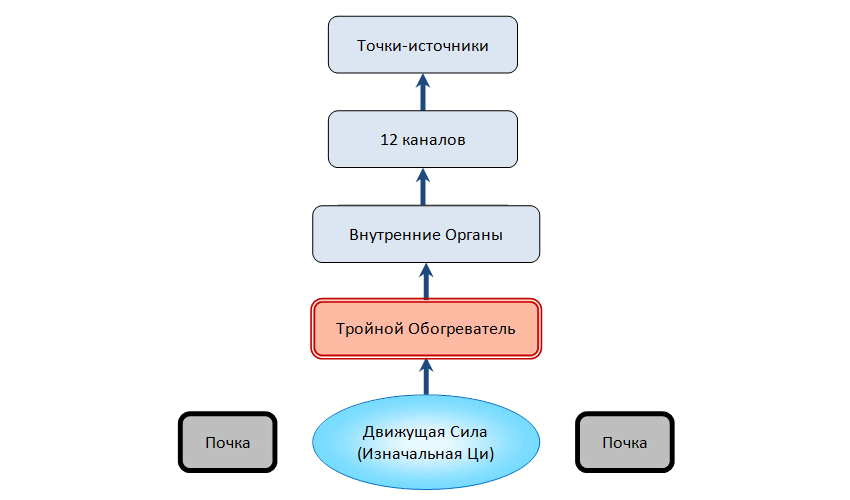 Источник первичной Ци находится в почках, через пути Сань-цзяо (тройной обогреватель) первичная Ци распространяется по организму.