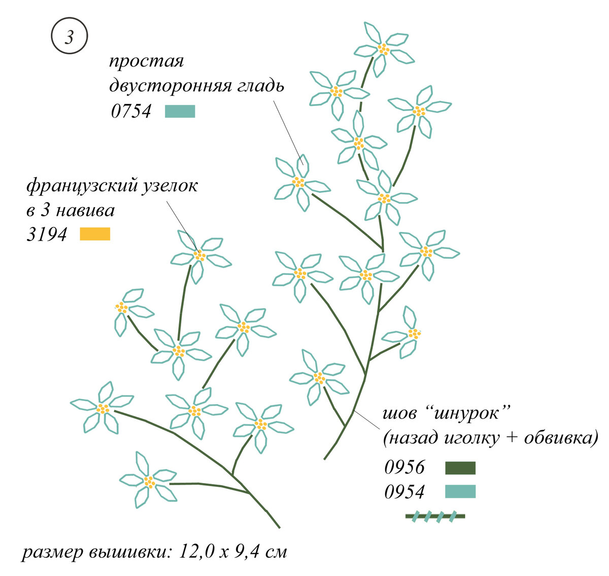 стебли вышиваются швом "шнурок" (шов "назад иголку" + обвивка).