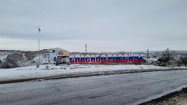 Особое отношение к гуманитарным грузам подчёркивает огромная надпись в цветах российского триколора высотой с человеческий рост. С другой стороны от дороги стоит гранитная плита в память о погибшем в 2015 году Максиме Мартакове — первом коменданте поселка Изварино с позывным «Сто пятый».