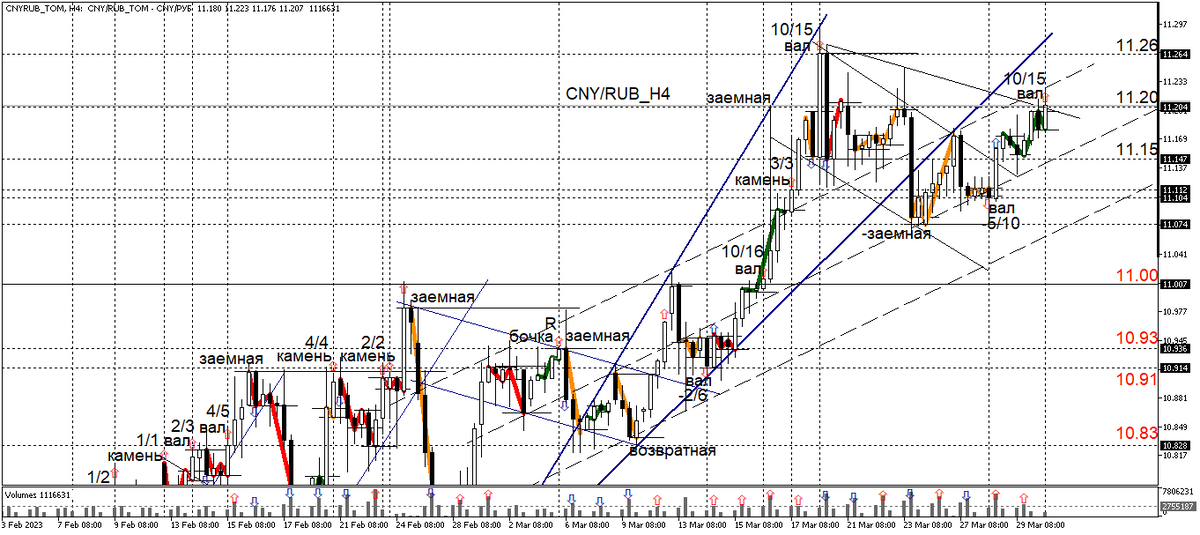 Всем привет! Если сегодня 30 марта, цена закрытия 4-х часового графика CNY/RUВ зафиксируется выше значения 11,20 произойдет изменение волновой картины, в результате чего на графике сформируется бычья импульсивная формация +2 (зеленая эллиотовская пятиволновка), длительностью 8 свечей. В результате этого, произойдет изменение направления тренд-вектора с нисходящего на восходящее. Анализ циклов показывает, что в этот момент на графике возникнет 10 циклов из 15 волновых пакетов или ВАЛ (10/15) в терминологии рафтинга. Параметр интерференции у этого волнового препятствия равен 0,67. Это считается высоким значением, поэтому система НЕ рекомендует покупать при таких высоких значениях. Более того, этот же цикл 10/15, с точно такими же параметрами уже был 20 марта, цикл сформировался тогда на уровне 11,264, что совпадает сейчас с локальным максимумом. Поэтому, чтобы покупать, я буду ждать, пока не сформируется бычья конструкция (+2+1). Telegram: t.me/awanowa Спасибо за внимание! Всем удачи