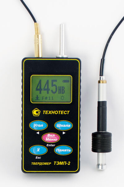 Портативный динамический твердомер ТЭМП-2 (рис. 1) измеряет твердость по разным шкалам: Бринелля, Роквелла, Виккерса и Шора. Диапазоны шкал, заданные прибором, при необходимости можно расширить. ТЭМП-2 обеспечивает калибровку от 2 до 10 точек шкалы твердости. При этом прибор поддерживает запись 64 шкал твердости, что позволяет проводить измерения твердости изделий из различных материалов по разным шкалам, в том числе на тонкостенных трубах.
