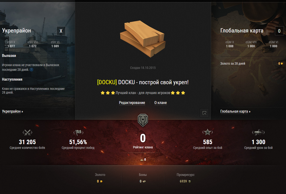 Всем привет, друзья. Хотел немного отвлечься от "обзоров" на танки и прочие механики и сделать небольшую, так скажем, рекламку своего клана. Мой клан DOCKU существует уже 4 года. За это время уже успели прокачать укрепрайон до 10 уровня. Но так как по личным причинам пришлось покинуть это игру больше чем на год, клан с начала 2022 года простаивал... Сейчас в клане только 4 активных игрока из общего количества в 6 игроков. И я с вашей помощью хотел бы исправить эту ситуацию. Мы рады абсолютно всем игрокам в клане. Условий по статистике - нет. Мы не набираем супер ярык статистов с 4000 дамага на топах. Главное условие - понимание игры, наличие несколько хороших танков 8 уровня и пару хороших танков 10 уровня. В основном - это обычная игра в рандоме, благодаря Боевому пропуску фармим промресурс для дальнейшей покупки резервов на серебро и опыт. Вылазки и прочие укреп. битвы - сугубо по желанию, никого не принуждаю. Глобальные войны - также по желанию. В конце 2021 года в клановых битв