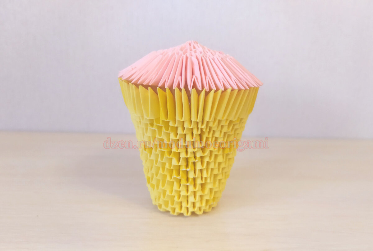 Здравствуйте, Друзья! Давайте сегодня соберем вкусное оригами МОРОЖЕНОЕ в вафельном стаканчике. У меня будет клубничное мороженое, вы можете выбрать свое. Список мастер классов. Для мороженого нам понадобится 380 модулей: 260 желтых, 120 розовых. Как собирать модули, можно посмотреть здесь. Все ряды собираем длинной стороной наружу. Начнем собирать с вафельного стаканчика. Собираем одновременно 3 ряда по 16 желтых модулей в каждом, ряды замыкаем в кольцо. Четвертый ряд 16 желтых модулей. Пятый ряд 16 желтых. Шестой ряд 16 желтых. Седьмой ряд 21 желтый модуль (через каждые 2 модуля надеваем по 2 модуля одним кармашком). Восьмой ряд 21 желтый модуль. Девятый ряд 21 желтый модуль. Десятый ряд 21 желтый модуль. Одиннадцатый ряд 21 желтый модуль. Двенадцатый ряд 24 желтых (6 модулей надеваем как обычно, далее 2 модуля одним кармашком и так далее по кругу). Тринадцатый ряд 24 желтых модуля. Четырнадцатый ряд 28 желтых модулей (надеваем 5 модулей как обычно, далее 2 модуля одним кармашком, да