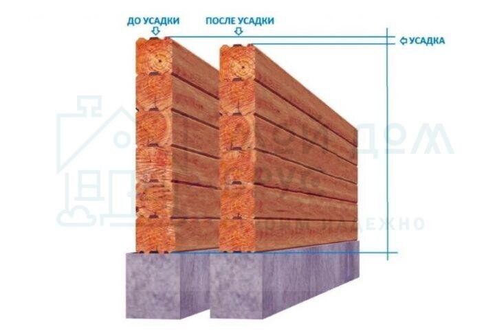 Наибольшую усадку дают стены из бревна, она может достигать 10 см на 3м высоты сруба. Чуть меньше она у оцилиндрованного бревна — до 8 см. Брус дает разную усадку в зависимости от его влажности: