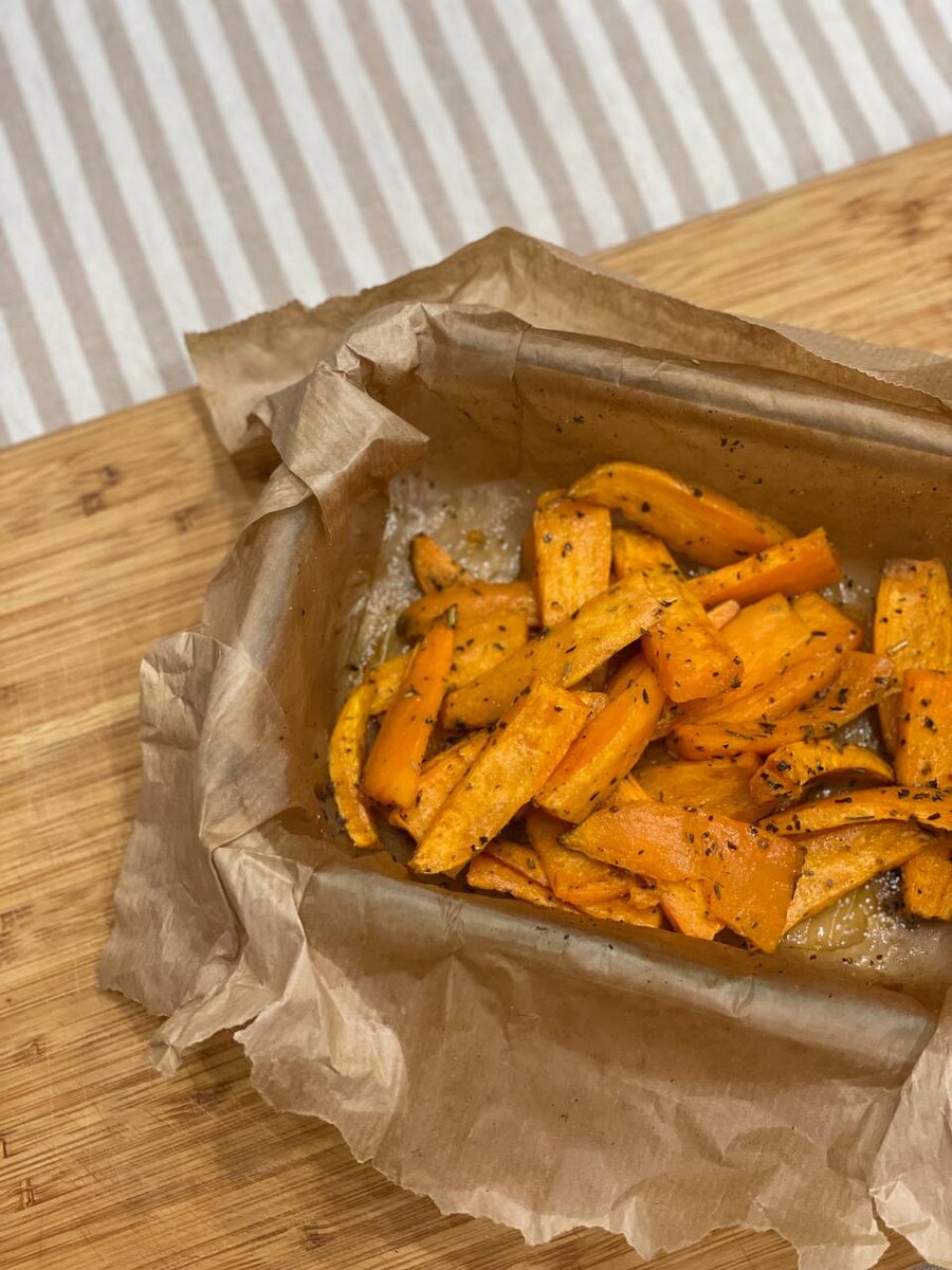Если вы не пробовали батат, то самое время это сделать. Мне даже в сыром виде он очень нравится - этакая хрустящая, сладкая морковка. Что же мы сегодня с ним будет делать? Правильно! Запекать со специями:) Ну, очень нежно получается Меня сегодня преследует одна песня и никак не отвязывается) Оставлю ее тут!)) Включаем музыку, а лучше ваш любимый плейлист, потому что потратим мы сегодня больше 1,5 часов. Батат требует времени. Но оно того стоит! Подготовка к готовке: На 2 товарища нам требуется: P.S. Мы используем батат в качестве гарнира, если вы хотите приготовить как основное блюдо, то смело увеличивайте все в 2 раза Готовка: 1. Экономим время и заранее разогреваем духовку до 180°C 2. Тщательно моем батат и чистим его. Разрезаем на три части, потом каждую часть разрезам вдоль пополам. И каждую отдельную дольку режем на прямоугольнички толщиной 5 мм. Хмм, как-то сложно написала. Просто выбирайте ту форму для бататинок, которая вам нравится) Хоть кольцами, но ширина ~ 5-7 мм! У меня