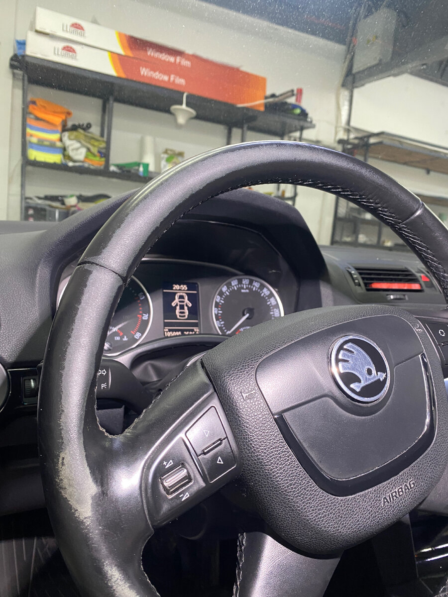 Если с руля немного стерлась краска его не обязательно перешивать. Можно обновить его внешний вид просто покраской. Вот такой затертый руль возможно восстановить и новое покрытие будет держаться ещё очень долго. Для этого первым делом очищаем поверхность кожи. Наносим чистящее средство с пенообразователя на щетку и круговыми движениями чистим руль. Пена вбирает в себя всю грязь, при необходимости повторяем процедуру и чистим руль несколько раз. После очищения переходим к этому обезжиривания поверхности. Наносим на салфетку обезжириватель и несколько раз обезжириваем руль, пока он не станет белёсым и матовым. Далее нас необходимо зашкурить поверхность кожи для сглаживания всех неровностей и лучшего сцепления с краской. Руль готов к покраске. Смешиваем в равных пропорциях чёрную краску и базу для пластика. Добавляем в смесь несколько капель отвердителя и немного разбавляем разбавителем по необходимости. Хорошо перемешиваем. На этом этапе закрываем все части руля, которые не собирае