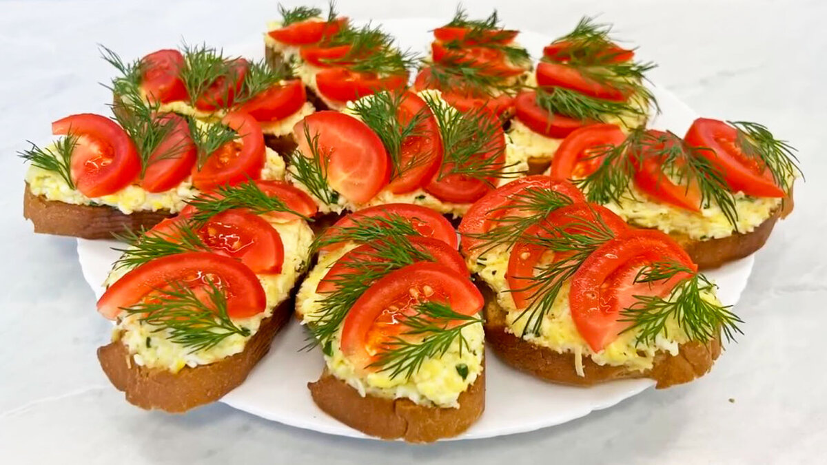 Красивая и аппетитная закуска на гренках с помидорами и яичной намазкой станет достойным украшением праздничного стола или подойдет в качестве экспресс закуски, если вдруг нагрянули гости. Ингредиенты 🔸Батон белый 10 кусочков 🔸Помидор 2-3 шт 🔸Чеснок свежий 2 зубчика 🔸Масло растительное 20-30 мл 🔸Яйцо куриное 4 шт 🔸Сыр твердых сортов 75 гр 🔸Лук зелёный 20 гр 🔸Майонез по вкусу 🔸Укроп для подачи 🔸Соль, перец по вкусу Как приготовить закуску на гренках с помидорами Яйца отвариваем вкрутую и остужаем. Белый батон нарезаем на ломтики толщиной 1 см. Для удобства к этому рецепту можно приобрести уже нарезанный батон. Кусочки батона выкладываем на противень и сверху при помощи кулинарной кисточки смазываем растительным маслом. Батон отправляем в заранее разогретую до 180°С духовку на 10-15 минут. Нужно чтобы хлеб подрумянился, подсушился и стал хрустящим. Готовым горячим гренкам из батона даем слегка остыть и сверху натираем зубчиком чеснока. Для намазки отваренные и очищенные от ско