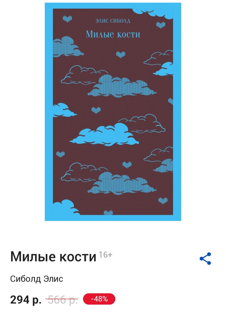 Пока искала книги в лабиринте, которые буду читать в апреле, наткнулась на эту. Дело было в далеком 2011-2012 году и я лежала дома с температурой (которой у меня, кстати, обычно не бывает) и читала "Милые кости" с экрана телефона. Почему я решила начать именно эту книгу, я уже не скажу, но кажется, где-то слышала обсуждение одноименного фильма. Сюжет интригующий, ведь главную героиню книги там кокнули🤯 уже в первой главе (и нет, это не спойлер). И дальше идет повествование от лица мертвой девочки с Небес или куда она там попала и от лица членов семьи (сестры, кажется) погибшей, ведь ее тело так и не нашли. Знаете, обычно книги и персонажи забываются за такой срок (больше 10 лет), но даже сейчас я помню, что книга была КЛАССНОЙ! И и мне было суперинтересно ее читать даже с температурой😀 Так что, если хотите, на книжку неплохая скидка в лабиринте) ваш шанс, так сказать