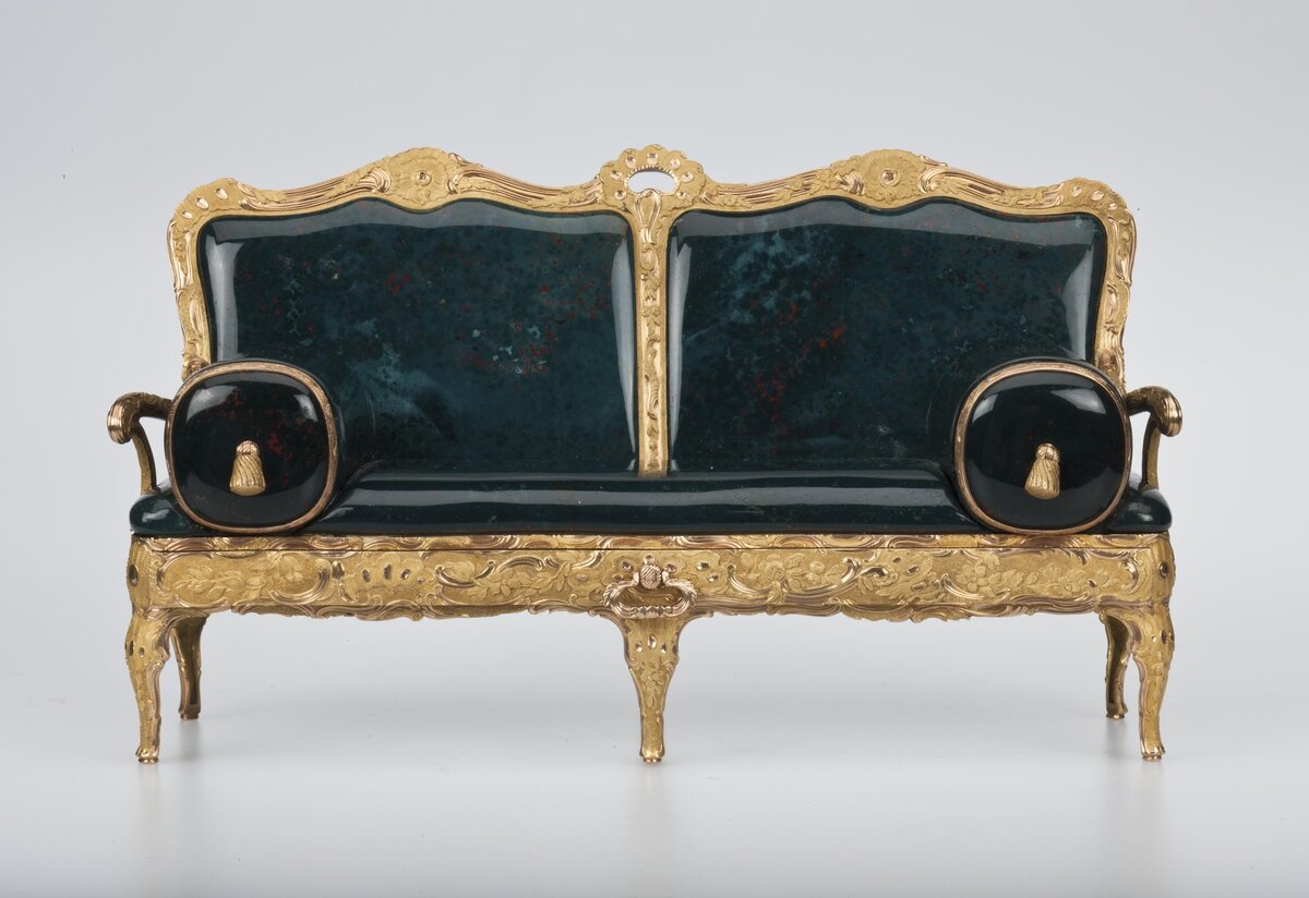 Наша загадка на этой неделе – миниатюрный диванчик. Как вы думаете, для чего он использовался? Диванчик изготовлен из гелиотропа, полированные пластины которого заключены в золотую оправу, чеканенную рокайльным орнаментом. Перламутровая пластина на задней стороне спинки украшена резьбой. Этот драгоценный диванчик копирует современные ему образцы мебели.
