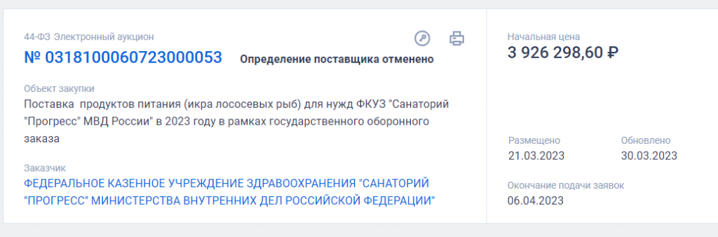 На Кубани санаторий МВД закупит 420 килограмм красной икры почти за четыре миллиона рублей; продукт будет оплачен из федерального бюджета. Об этом 30 марта корреспондент «Утреннего Юга» узнал, изучив портал госзакупок. Заказчиком деликатеса выступает санаторий «Прогресс» МВД России в Сочи. Согласно документам, закупка проходит в рамках государственного оборонного заказа. Потенциальный поставщик должен доставить продукты питания – 420 килограмм красной икры первого сорта. Начальная цена – 3 926 298,60 рублей. Закупка была размещена на портале 21 марта, срок окончания заявок – 6 апреля 2023 года. Источником финансирования указан федеральный бюджет. Подрядчик должен доставить в санаторий икру в жестяных баночках с ключом массой от 100 до 150 грамм. Ранее «Утренний Юг» рассказал, что анапский санаторий Министерства внутренних дел «Юность» решил с размахом отметить Новый год, заказав почти тонну икры. Для праздника руководство планировало заказать примерно по полтонны икры тихоокеанских лос