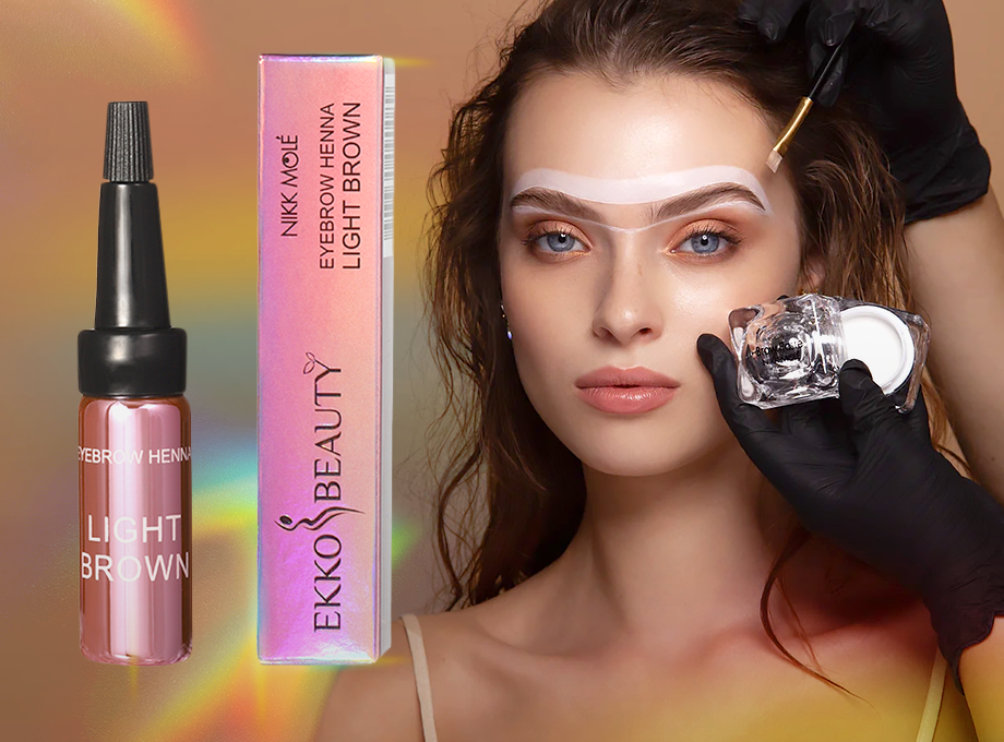 - Тонкие волоски со слабым натуральным цветом стоит укреплять хной, которая уплотняет структуру бровей и придает естественный блеск. Хна для бровей EkkoBeauty выпускается в большой линейке оттенков, поэтому каждая сможет подобрать для себя оптимальный тон.