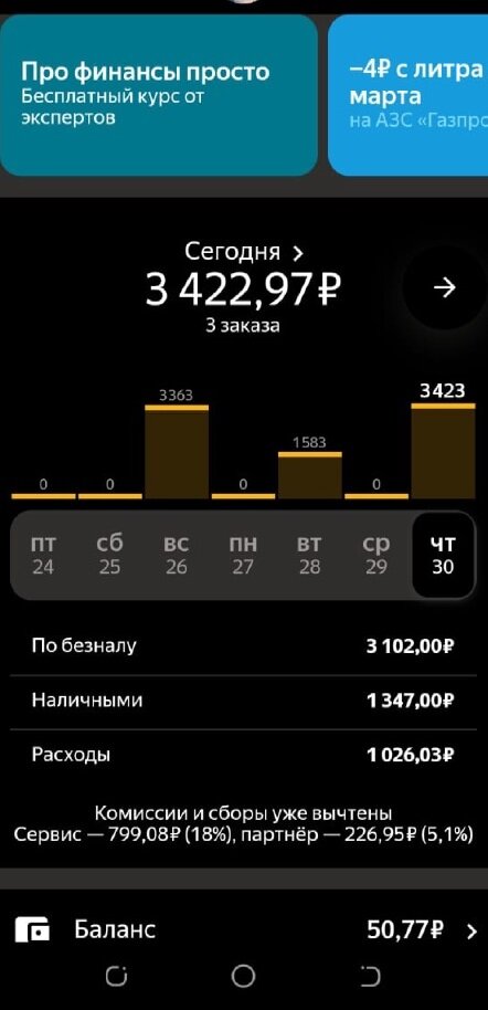 Очень часто водители, особенно те, кто только начал работать в Яндекс, обращаются, причем, довольно часто, с возмущением, что ему показывает одну сумму, а вывести он может намного меньше, что парк/яндекс удерживает его средства. На главном экране, где карта, водитель рядом со своим фото видит сумму, которая меняется в течение дня в зависимости от количества выполненных заказов. Та же сумма отображается в профиле. То есть, водитель заходит в профиль и видит там сумму, решает вывести средства, а для вывода оказывается доступна совсем другая сумма, меньшая. То есть, для примера, в этом случае водитель видит сумму 3422р, а для вывода доступно 1800р с небольшим. Но, чтобы разобраться, водителю просто надо посмотреть немного ниже суммы, под график с днями. Именно там указано, сколько было получено по безналичным заказам, сколько наличными, а сколько было вычтено за счет комиссии (да-да, в этом парке зверская комиссия 5%). Если водитель обратится с этим вопросом в парк, то ему могут или объя