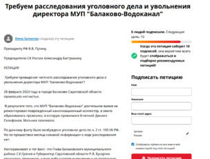 В Балаково создали петицию на имя президента России Владимира Путина и председателя Следственного комитета РФ Александра Бастрыкина. Петиция с заголовком «Требуем расследования уголовного дела и увольнения директора МУП «Балаково-Водоканал»» опубликована на change.org. 28 февраля в Балаково 8-летний мальчик погиб, когда упал в промоину муниципального коллектора. За этот коллектор отвечает МУП «Балаково-водоканал». На следующий день после гибели ребенка место происшествия перекопали. Было возбуждено уголовное дело по ч. 2 ст. 109 УК РФ. Но за месяц никакой информации о ходе расследования нет. До сих пор не названы подозреваемые. «Настораживает и тот факт, что глава Балаковского муниципального района С.Е. Грачев и Губернатор Саратовской области Р.В. Бусаргин отказались принимать какие-либо кадровые решения и не отстранили от должности директора МУП “Балаково-Водоканал” Мельника Станислава Васильевича. Поэтому С.В. Мельник продолжает руководить предприятием и имеет возможность влиять на х