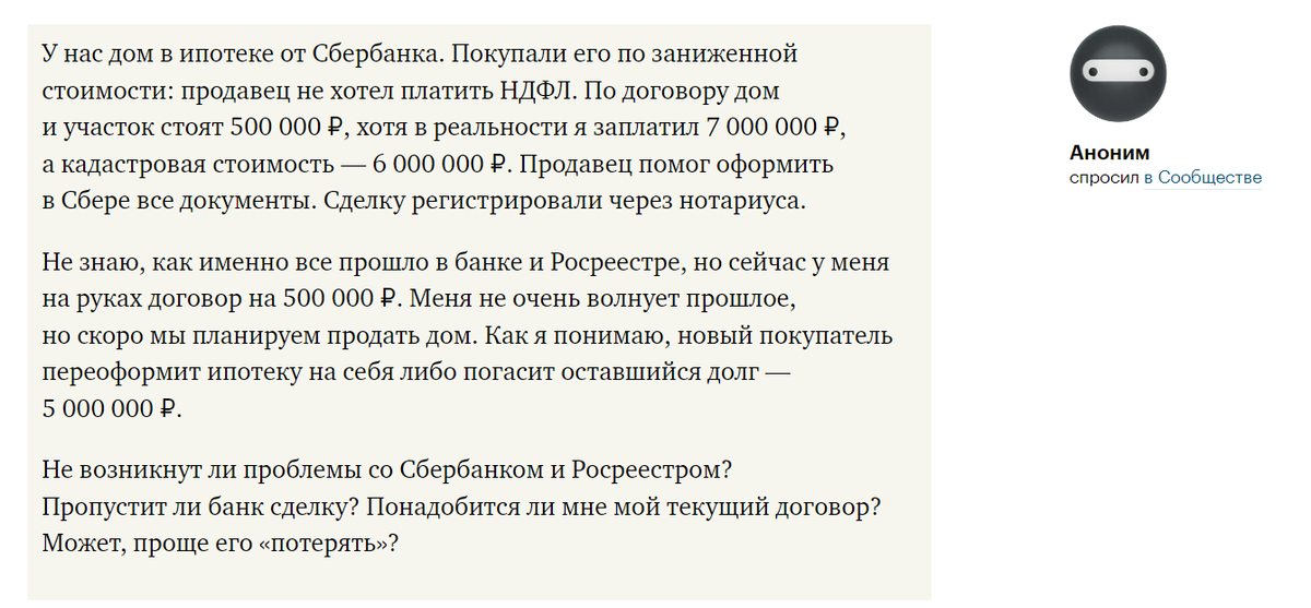 "У нас дом в ипотеке от Сбербанка. Покупали его по заниженной стоимости: продавец не хотел платить НДФЛ."