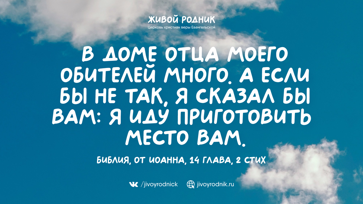 В доме Отца Моего обителей много. А если бы не так, Я сказал бы вам: Я иду приготовить место вам. Библия, от Иоанна, 14 глава, 2 стих Не будем забывать, что наша жизнь на земле – это всего лишь временное пристанище для душ наших. Поэтому будем стараться, чтобы ничем и никем души наши не были увлечены на этой земле. Не будем дожидаться явления дня Господа, чтобы осудиться от Слова Божьего, но приготовим себя, очищая, освящая сердца наши и исповедуя грехи свои, и получим освобождение и избавление от всяких пут и зависимостей для достойного ожидания Господа. Как мудрые девы, приблизимся в это время к Господу. Будем искать лица Его, оставляя суету и беспечную жизнь по плоти и принимая Божью волю и Его руководство в нашей жизни. Обильных вам Божьих благословений в этом дне, ограды Божьей и защиты!