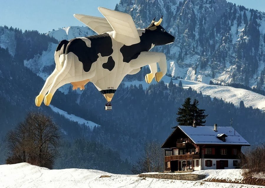 А коровы летают? Кажется, любой первоклассник в состоянии дать ответ на этот вопрос: нет. Ведь корова — не птица, крыльев у нее нет. Она передвигается исключительно на своих четырех лапах. По крайней мере, мы привыкли так считать. В горах же Швейцарии коровы и правда летают, причем десятками штук. Так, пару раз в год туристы и местные жители могут наблюдать удивительную картину: корова парит где-то в воздухе, прицепленная к вертолету. И это вызывает вопросы? Зачем буренок так катают? Не испытывают ли они от этого сильный стресс? Неужели животных нельзя перевозить как-то более... безопасно? Давайте вместе разберемся в теме. Все дело в том, что коровы в Швейцарии, как та самая буренка из рекламы шоколада, и правда пасутся в горах. Ежегодно около тысячи животных уходят весной в Альпы, где счастливо пасутся и набираются сил, чтобы из их молока потом делали вкуснейшие шоколад и сыры. Увы, в жизни не все бывает гладко. Вот и счастливые швейцарские коровы порой попадают в совершенно жизненные