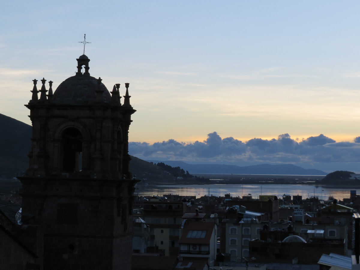 Утром с балкона открывался отличный вид на спящий город. На озере был полный штиль. По горам медленно полз густой туман. Редкие птицы только начинали подавать свои ещё сонные голоса, а улицы пустовали, создавая ощущение, что людей здесь вообще нет. Но как только взошло солнце, словно по сигналу, город стал оживать. И вот уже центр наполнился привычными для Пуно криками людей, сигналами автомобилей и лаем собак.