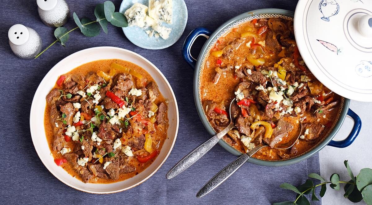 Скорее зовите всех домочадцев к столу 😉 Рагу с говядиной и перцем в горшочке источает невероятно аппетитный запах. Говядина получится очень сочной и мягкой. Говядина получится очень сочной и мягкой. Готовить пищу в горшочках начали много веков назад – глиняную посуду ставили в печь, и еда в ней томилась. В горшочках не только запекали и тушили мясо или овощи, но и готовили кашу, суп. Так продолжают делать и сегодня, только у современной хозяйки вместо печи – духовка. Приготовление такого блюда, как говядина в горшочке, не потребует много ваших усилий и внимания – немного предварительной подготовки, закладываем ингредиенты, а дальше – «горшочек, вари!». Этот рецепт подойдет для обеда или ужина ⬇️ Ингредиенты: 400 г говядины 1 сладкий желтый перец 1 сладкий красный перец 1 луковица 3–4 зубчика чеснока 120 г сметаны 1 ст. л. томатной пасты 4 ст. л. растительного масла 150 г сыра с голубой плесенью соль свежемолотый черный перец микрозелень для подачи Пошаговы