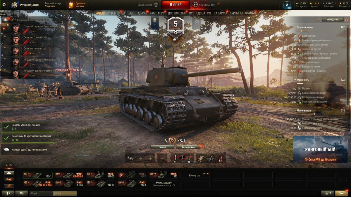 Сегодня хочу разобрать несколько танков из советской ветки тяжелые танки на пути к об 705А. От отца наслышан про эту ветку, венец этой ветки его любимый танк. И мне захотелось посмотреть что из себя вообще представляет эта ветка. Начну с 5 уровня КВ-1 В принципе довольно неплохой танк для своего уровня. Кв имеет не плохую круговую броню что уже говорит о игре от ромба так как если стоять ровно, то исход будет очень плачевный. Пушка для своего уровня пробивает неплохо с 7 уровнями конечно не помешает голда, по урону середняк для своего уровня. Танк обладает не очень хорошей мобильностью так, что на открытых картах придется пострадать. В городе же кв чувствуется себя более чем хорошо особенно если играет от борта Как пример покажу свой момент, где я мог дать отпор даже танку 7 уровня. Из оборудования я ставил В целом танк мне понравился и проходится легко, когда выводится в топ Следующий идет КВ-1С в простонародье квас Честно заходя наперед танк мне не зашел, брони на