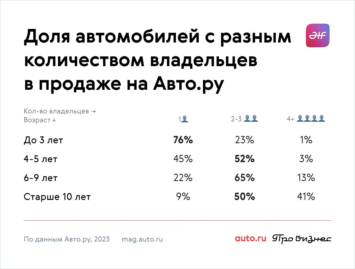 Я уже рассказывал, среди каких моделей лучше всего искать свой будущий автомобиль, если хочется найти его от первого владельца или от 2-3 собственников. Закончим эту тему общей статистикой: как часто вообще в продаже попадаются такие экземпляры. Спойлер: достаточно часто! Вообще около 70% объявлений на Авто.ру — это автомобили, которые продают собственники. Логично, что чем автомобиль старше, тем сложнее найти его «из первых рук», зато реально — с 2–3 владельцами. А ещё количество владельцев сказывается на цене. Автомобиль, который продаёт первый владелец скорее всего будет дороже, чем с большим количеством собственников (в среднем на 7–12%). Хотя это актуальнее для свежих экземпляров, потому что уже среди машин 4–5 лет разница обычно — менее 5%, а у более «взрослых» — такой зависимости вовсе нет. Источник: Журнал Авто.ру *** С уважением, Ваш независимый автоэксперт Дмитрий Демидов 🚗