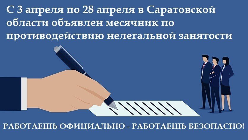В период с 03 по 30 апреля в Саратовской области проводится Месячник противодействия нелегальной занятости. Его цель – привлечение внимания жителей региона к проблеме «теневой» занятости, информирование о последствиях работы без оформления трудовых отношений, важности соблюдения трудового, налогового и пенсионного законодательства. В рамках проведения Месячника по противодействию нелегальной занятости на территории Балаковского муниципального района продолжается реализация мер, направленных на снижение неформальной занятости. От работодателей требуется обеспечить соблюдение действующего законодательства в сфере труда при трудоустройстве наемных работников. Граждане могут сообщить о факте отказа работодателя официально оформить трудовые отношения, выплаты им заработной платы «в конверте». Сведения о нелегальных трудовых отношениях принимаются анонимно по телефонам: