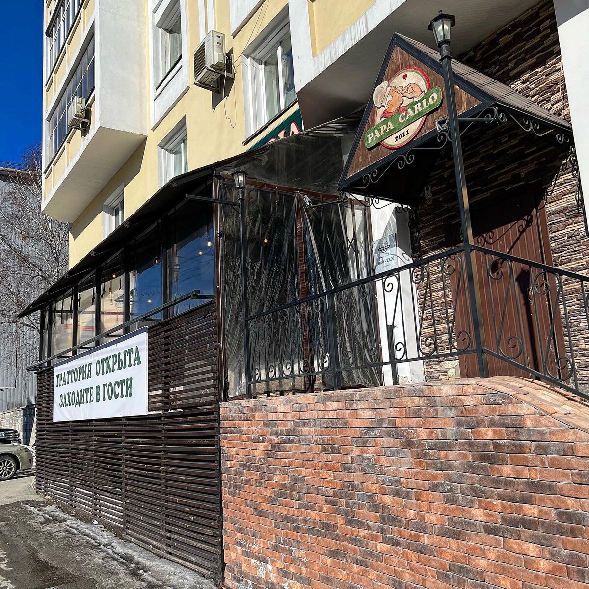 Пицца Маргарита по 380 ₽ из меню траттории Papa Carlo. Эта пиццерия — первый кандидат в «Битве пицц» и безусловный лидер в ваших рекомендациях. В составе: фирменный соус, сыр моцарелла, зелень. Вес 400 г. Размер 30 см. Пиццу приносят буквально минут через 10. Подаётся она на деревянной подложке с ножкой. Своего рода постамент для пиццы. Пицца на очень тонком тесте, но при этом не выглядит как фокачча. Томатная паста хороша, сыр тянется. Начинки достаточно. Всё гармонично. Единственный минус — слегка подгоревшая зелень. Да, зеленью здесь не украшают, её кладут между соусом и сыром. Бортов почти нет. Классика. После римских пицц от такого многие отвыкли. Оценка 9,5 из 10. Одно из преимуществ Papa Caplo в том, что они держат приличный уровень уже больше 10 лет. Нарваться здесь на неприятный сюрприз в плане качества пиццы — это нужно постараться. #yelpilбитвапицц