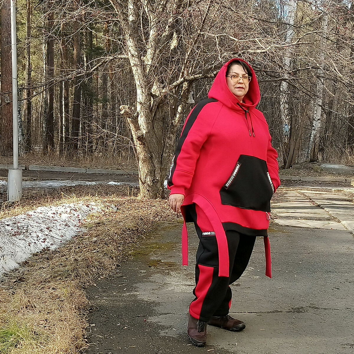 Друзья,показываю костюм ! Навела прическу,пошла,а на улице такой ветер! Ну как смогу,покажу. Да,я немолодая,мягко говоря,но в голове возраста нет,там живет особа лет 30 . И да,размерчик имеем королевский! За последние 17 лет фигурку не только сохранила,но и удвоила! И эту красоту,таки, надо шикарно одевать! Поскольку,одежду я не покупаю,одеваюсь я по законам той самой 30-летней особы,что в моей голове застряла. Не хочу я скучные,неприметные одежды! Советы "стилистов", инфлюенсеров и всякого другого блогерского шлака не слушаю и считаю тупыми( они и есть такие). Поэтому на свой нехилый размер я надену красный костюм! Пущай,у тех стилистов глаза повылазят от возмущения! Футер ,начес,толстенький и тепленький. Штаники -революционные шаровары,буквально,с лампасами.У них боковая линия прям округлая. Сверху резиновый пояс,два кармана в швах и один накладной. Худи с карманом по переду,капюшон с запахом,рукав реглан. По бокам вырезы с декоративными планками из кошкорсе. Можете кидать в ме