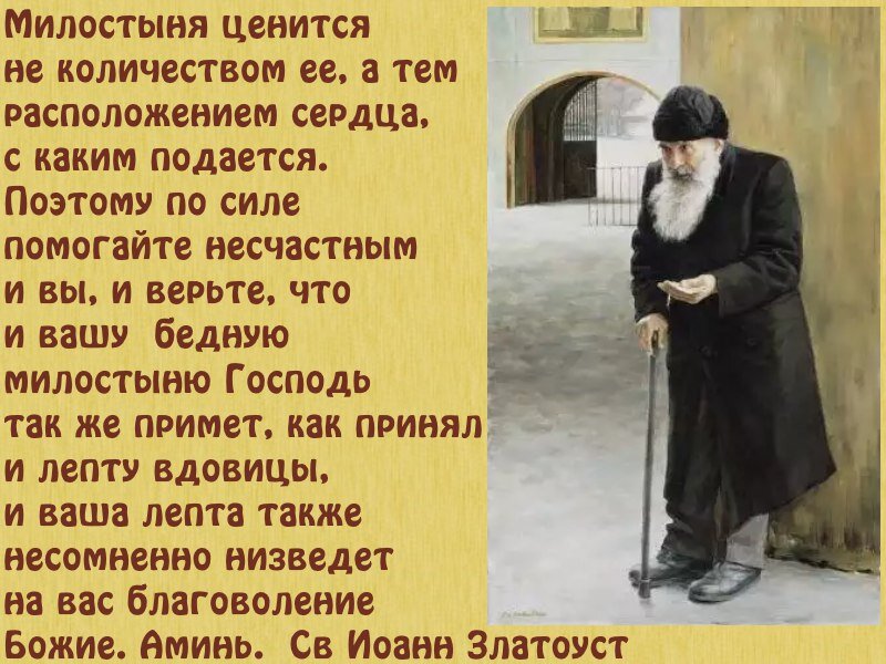 Слушала выпуск программы "Делатели" на радио "Вера" о служении врача и священника с участием священника Игоря Блинова и услышала красивую фразу: "Ты даешь серебро, а получаешь Небо". Отец Игорь сказал, что это слова святого Иоанна Златоуста. Я поискала, нашла. У Златоуста звучит немного иначе, но смысл тот же. Заодно на этой же странице http://www.troica.org/useful/useful_852.html нашла еще две важных для себя мысли (а там вообще шикарная подборка о милостыне). Одна касается моей любимой притчи о десяти девах, и тут под елеем святой Иоанн как раз понимает милостыню: Притча о десяти девах. Высоту милостыни Златоуст не раз иллюстрирует ссылками на притчу о десяти девах (Мф.25,1-12). И везде под елеем, которого недостало у пяти юродивых дев, святитель понимает милостыню: "За то они и были исключены из брачного чертога, что не имели елея; а елей есть не что иное, как человеколюбие, и милостыня, и благорасположение, ипредстательство на терпящих несправедливость, и утешение плачущих; эт