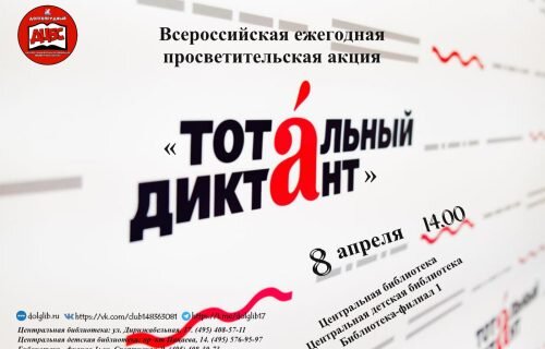Завтра, 8 апреля, Долгопрудный примет участие в ежегодной просветительской акции «Тотальный диктант». Проверить свою грамотность и познакомиться с современной русской литературой – такая возможность в рамках данного общественного проекта есть у каждого желающего. Попробовать свои силы можно как на очных площадках, так и в любом удобном месте онлайн. Жители нашего округа могут написать диктант в библиотеках города. В этом году текст для диктанта подготовил писатель из Владивостока Василий Авченко. Книга за книгой он открывает для читателя Дальний Восток, его историю и современность, знаменитых жителей. В нашем городе будет действовать три площадки «Тотального диктанта»: Обращаем внимание: необходима предварительная регистрация. Оставить заявку на участие в диктанте лучше заранее по телефонам библиотек или по адресу электронной почты biblio.dol@yandex.ru. Начало мероприятия в 14:00.