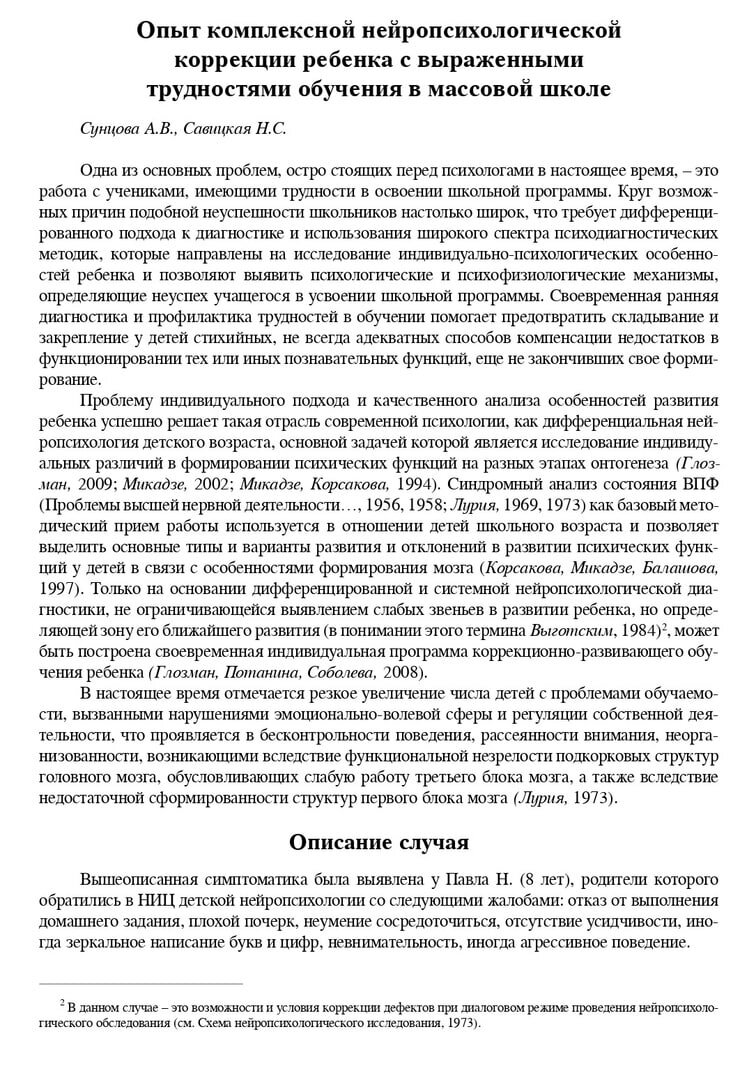 Опыт комплексной нейропсихологической коррекции ребенка с выраженными трудностями обучения в массовой школе (А.В.Сунцова, Н.С.Савицкая)