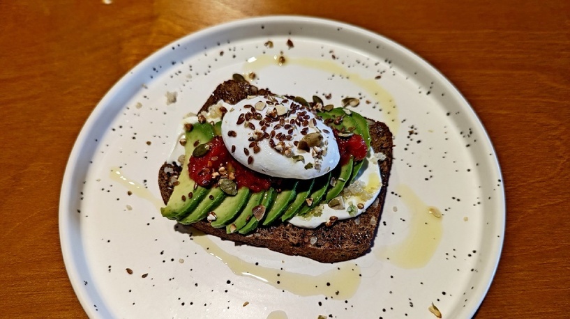 Авокадо спел, мягок и нежен, как сливочное масло. Пашот, теплый и целый, растекается желтком, стелется золотым туманом. Семечковый хлеб с хрустинкой на срезе, как и положено по его тостовому канону. Посыпка из тех же семечек опять же, немного сливочности молодым сыром, чуть фруктовости.
