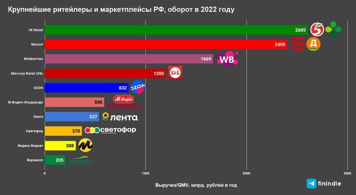 Практически все компании, завязанные на ритейл, отчитались за 2022 год. Мне захотелось сравнить некоторые традиционные торговые сети и маркетплейсы - насколько одни крупнее других по обороту на данный момент. Продажи в 2022 году: 1). X5 Retail Group - 2, 6 Трлн ₽; 2). Магнит - 2, 4 трлн ₽*; 3). Wildberries - 1, 67 Трлн ₽; 4). Mercury Retail - 1, 2 Трлн ₽*; 5). OZON - 832 Млрд ₽; 6). М.Видео - 590 млрд ₽*; 7). Лента - 537 млрд ₽; 8). Светофор - 370 млрд ₽*; 9). Я.Маркет - 308 млрд ₽; 10). Вкусвилл - 205 млрд ₽. * - Собственная оценка на основе данных за 1 полугодие 2022 и динамики роста выручки (компании ещё не отчитались официально). Важно понимать, что это не совсем топ-10. В топ-10 могут попасть сети Окей, Ашан, Metro. Данные по ним посчитать достаточно проблематично. Традиционные ритейлеры растут темпами, равными инфляции. В то время как маркетплейсы продемонстрировали в 2022 выдающуюся динамику роста продаж: WB +98%, OZON +86%, Я.Маркет +92%. Если такая динамика продолжится, уже на