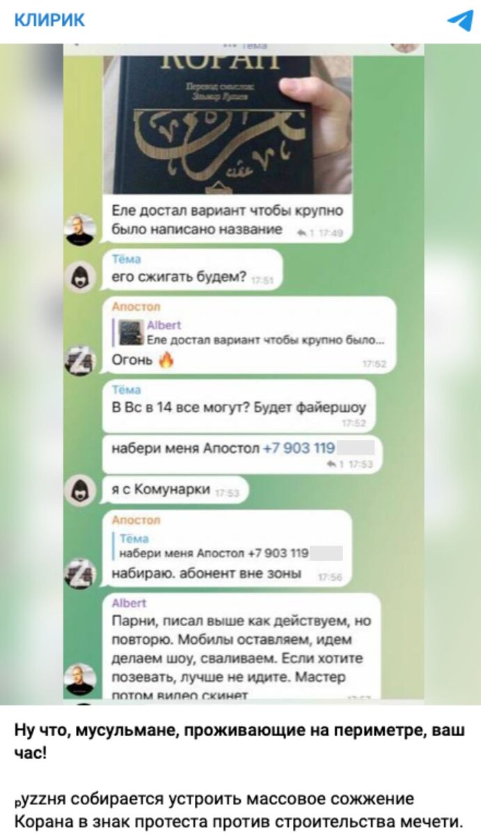 Православные активисты хотели публично сжечь Коран в рамках протеста против строительства мечети у Святого озера в Москве. В сети появился скриншот переписки, где якобы обсуждаются детали будущего поджога. На деле никакого сговора о поджоге священной книги не было. Очевидно, что вброс создавался в целях разжигания межнационального и межконфессионального конфликта. Источники фейка утверждали, что переписка велась в комментариях телеграм-канала православного активиста Максима Дивнич, ранее выступавшего против строительства мечети. Однако он опроверг эту информацию, отметив, что на момент создания фейка, чат его телеграм-канала был закрыт для комментариев. Следовательно вести подобную переписку не представлялось возможным. Что же касается самого конфликта — он был исчерпан еще на днях после заявления мэра Москвы Сергея Собянина о переносе строительства мечети на Святом озере в другое место, в полутора километрах от предыдущего. С учетом обращений, мечеть будет располагаться в отдалении от