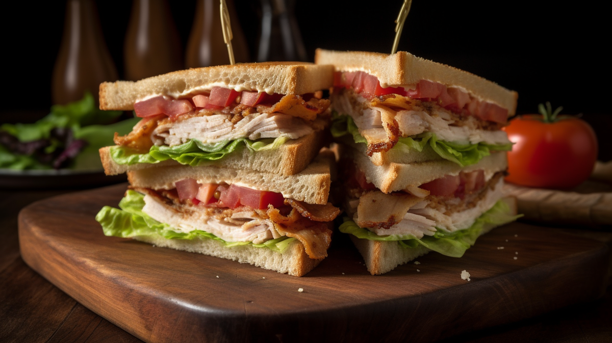 - Сверху на каждый бутерброд положи последний ломтик поджаренного хлеба и закрепи каждый бутерброд зубочисткой или шпажкой.